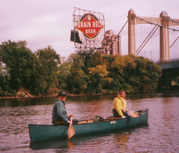 Judy and Chris float past the old Gain Belt Beer sign near the Hennepin Avenue bridge |