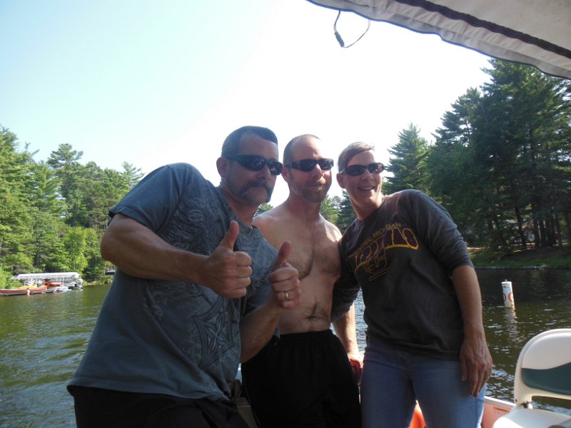 Nate, Joel and Christine giving a thumbs up on the pontoon ride.